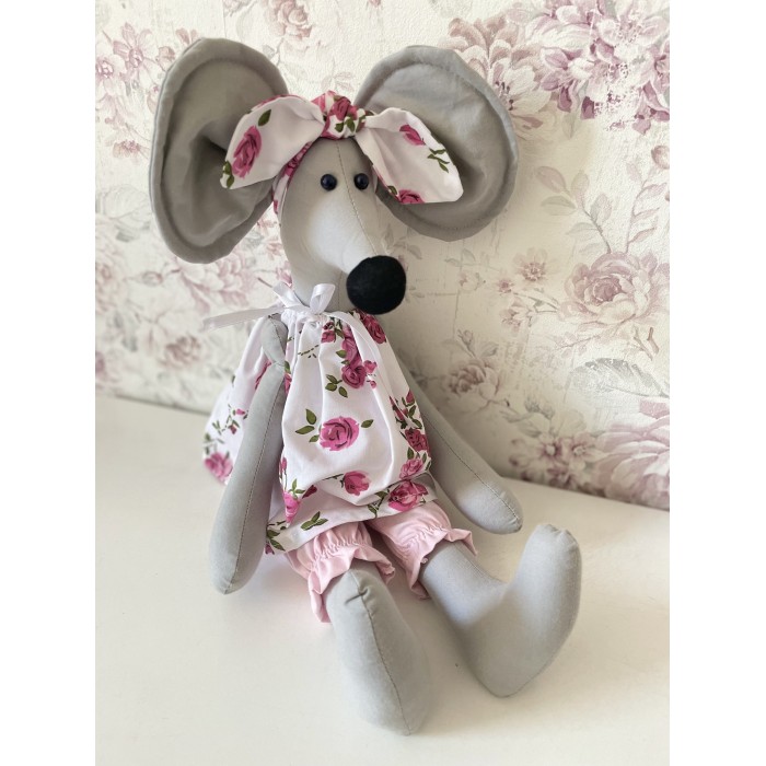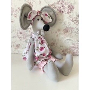 Myszka wykonana jest w całości z bawełnianej tkaniny w odcieniu szarości. Charakterystycznym elementem są uszka, które dodają maskotce wyjątkowego uroku. Maskotkę zdobi tunika z motywem kwiatów w odcieniu pudrowego różu oraz spodenki wykończone bawełnianą koronką.