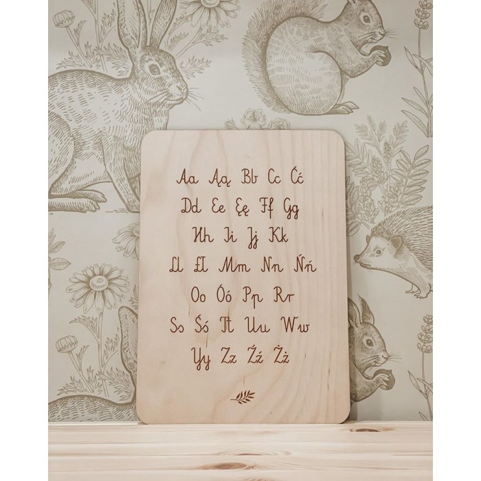 Drewniany alfabet wykonany jest ze sklejki z drewna liściastego. Alfabet przedstawia duże i małe litery polskiego alfabetu. Doskonale sprawdzi się do nauki i powtarzania literek.