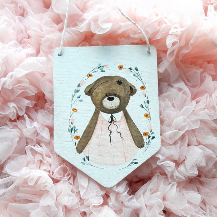 Proporczyk miś został stworzony, aby upiększyć wnętrze dziecięcego pokoju. Gwarantujemy, że będzie wyjątkową pamiątką na długie lata. Proporczyk zachwyca delikatnym designem. A sam motyw misia jest ręcznie malowany. Dzięki temu otrzymujemy oryginalny i niepowtarzalny produkt. Projekt misia jest również autorski.