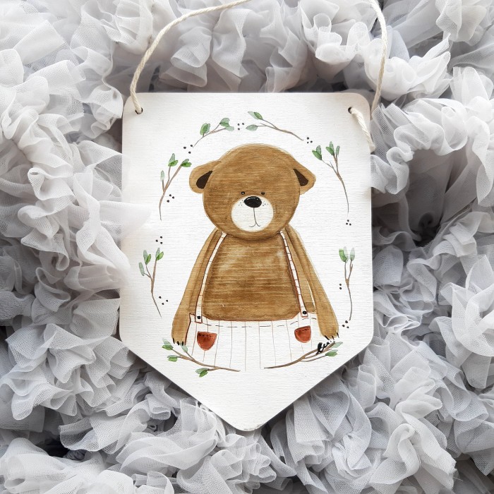 Proporczyk miś został stworzony, aby upiększyć wnętrze dziecięcego pokoju. Gwarantujemy, że będzie wyjątkową pamiątką na długie lata. Proporczyk zachwyca delikatnym designem. A sam motyw misia jest ręcznie malowany. Dzięki temu otrzymujemy oryginalny i niepowtarzalny produkt. Projekt misia jest również autorski.