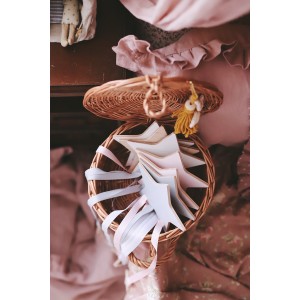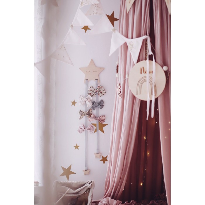 Organizer posiada tasiemki rypsowe w kolorze szarym do których przypinamy spineczki. Gwiazdka jest naturalna wyróżnia się zdobieniem w postaci oczek wypalanych laserem. Organizer mocujemy za pomocą dołączonej taśmy dwustronnej do ściany, drzwi czy mebli.