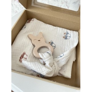 Muślinowa przytulanka autka z klonowym gryzakiem
